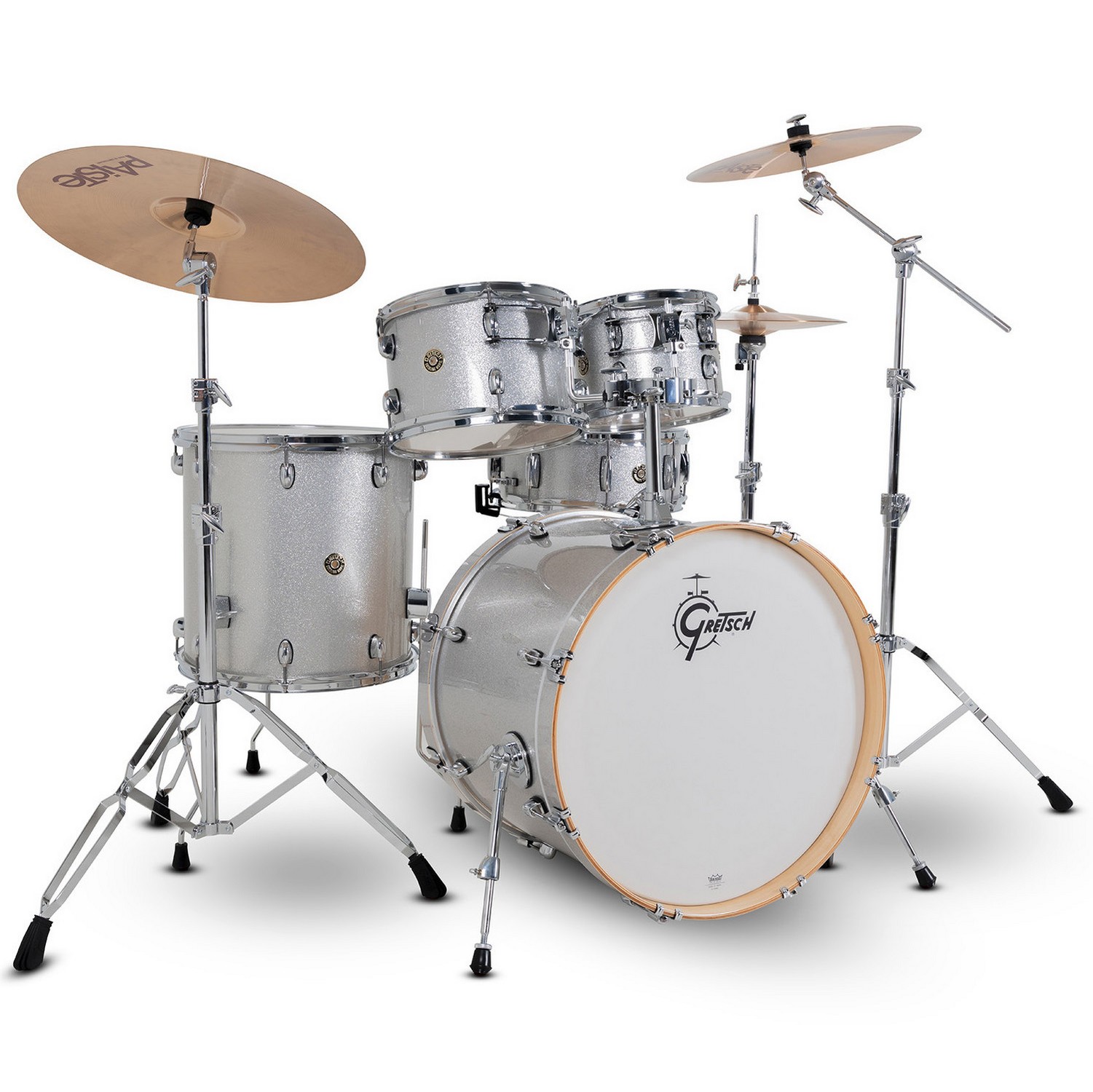 The 7-ply Gretsch-formula maple shell has 30-degree bearing edges and natural shell interiors. Bass drums include telescopic bass drum spurs and matching maple wood bass drum hoops. Toms and snare drums feature 2.5mm triple flanged hoops. All drums are fitted with Remo® drum heads.